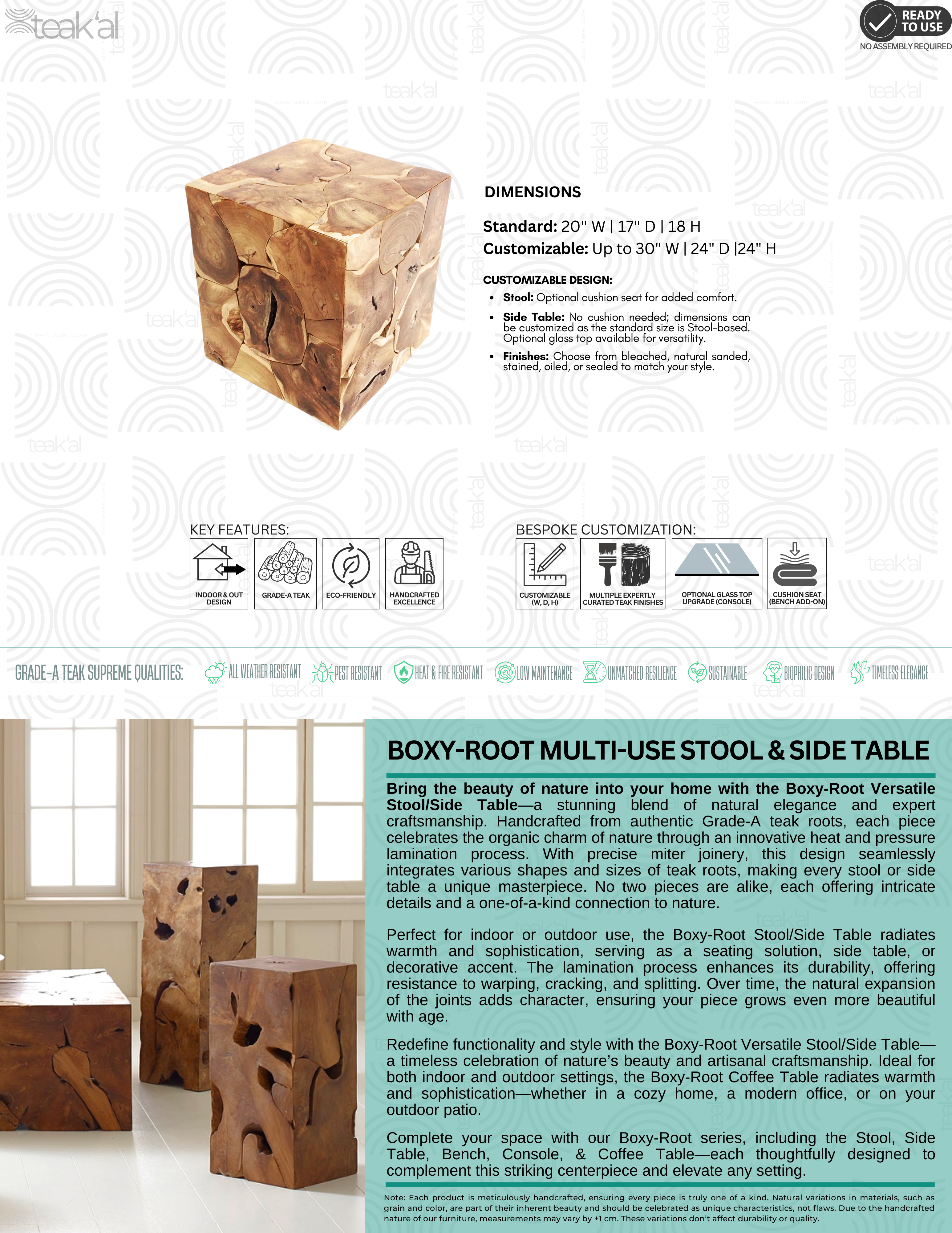Bring the beauty of nature into your home with the Boxy-Root Versatile Stool/Side Table—a stunning blend of natural elegance and expert craftsmanship. Handcrafted from authentic Grade-A teak roots, each piece celebrates the organic charm of nature through an innovative heat and pressure lamination process. With precise miter joinery, this design seamlessly integrates various shapes and sizes of teak roots, making every stool or side table a unique masterpiece. No two pieces are alike, each offering intricate details and a one-of-a-kind connection to nature.