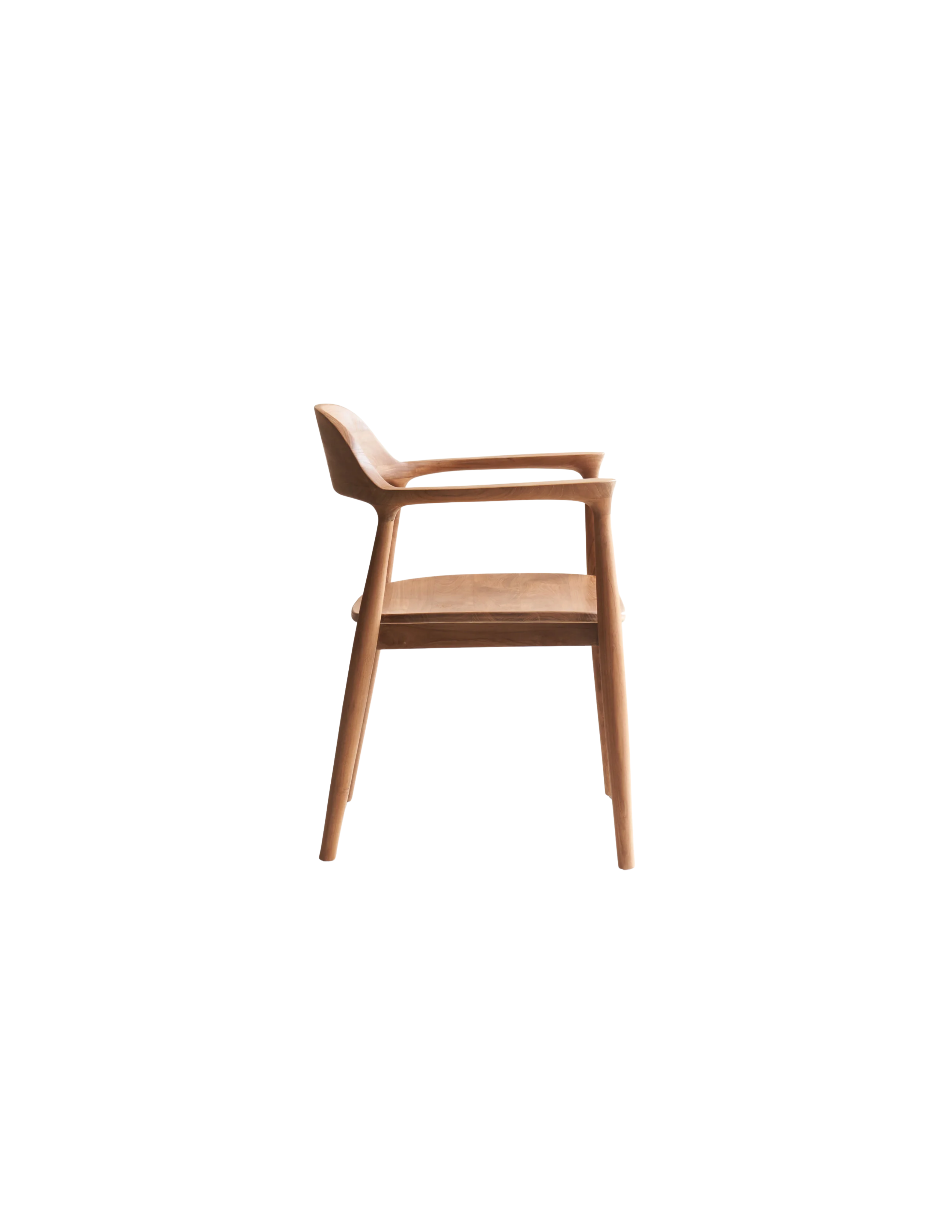 Expertly handcrafted from 100% Grade-A teak wood, the Oris Dining Chair embodies elegance, comfort, and timeless durability. Meticulously hand-sanded to a silky-smooth finish, its rounded backrest seamlessly connects to both arms, creating a visually harmonious and supportive structure. The curved seat, gently indented at the center, enhances comfort, making every seating experience effortlessly enjoyable.
