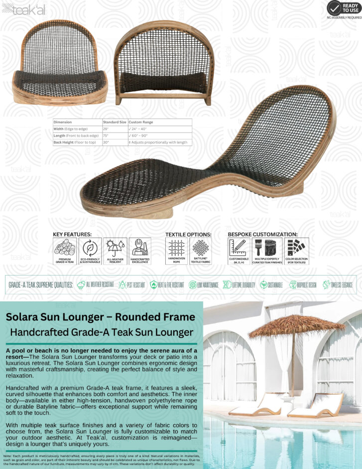 With multiple teak surface finishes and a variety of fabric colors to choose from, the Solara Sun Lounger is fully customizable to match your outdoor aesthetic. At Teak’al, customization is reimagined—design a lounger that’s uniquely yours.