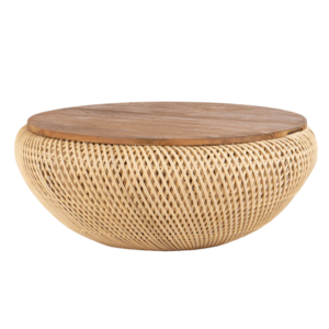 Expertly constructed from solid Grade-A teak—never reclaimed—with a handwoven rattan exterior and a sturdy iron frame, it combines durability with artisanal beauty. Its rounded silhouette, subtly tapered base, and sculptural presence conceal a hidden storage compartment beneath a removable teak lid, offering seamless organization.