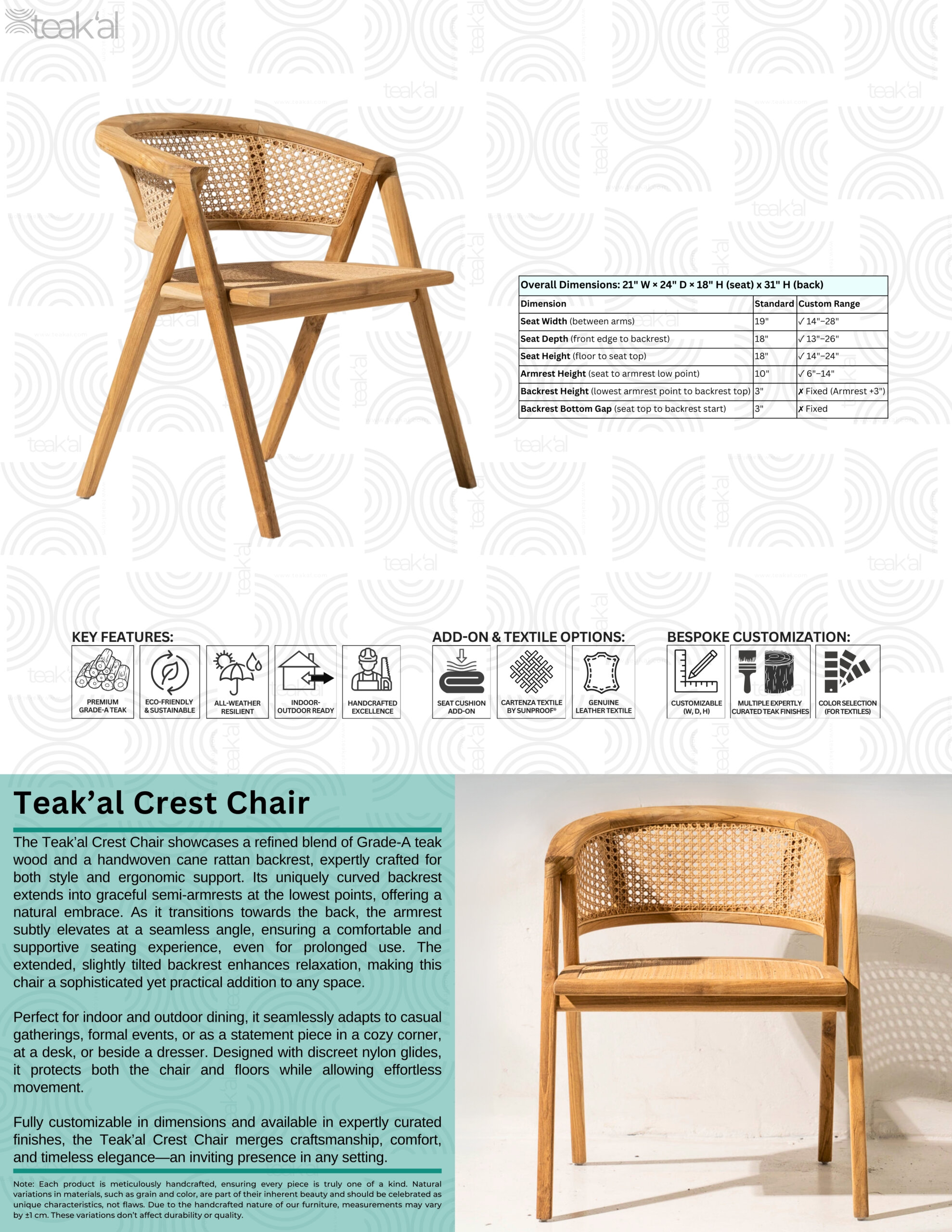 Each finish is meticulously crafted to ensure longevity and aesthetic harmony, making your Teak’al Crest Chair a timeless statement piece.