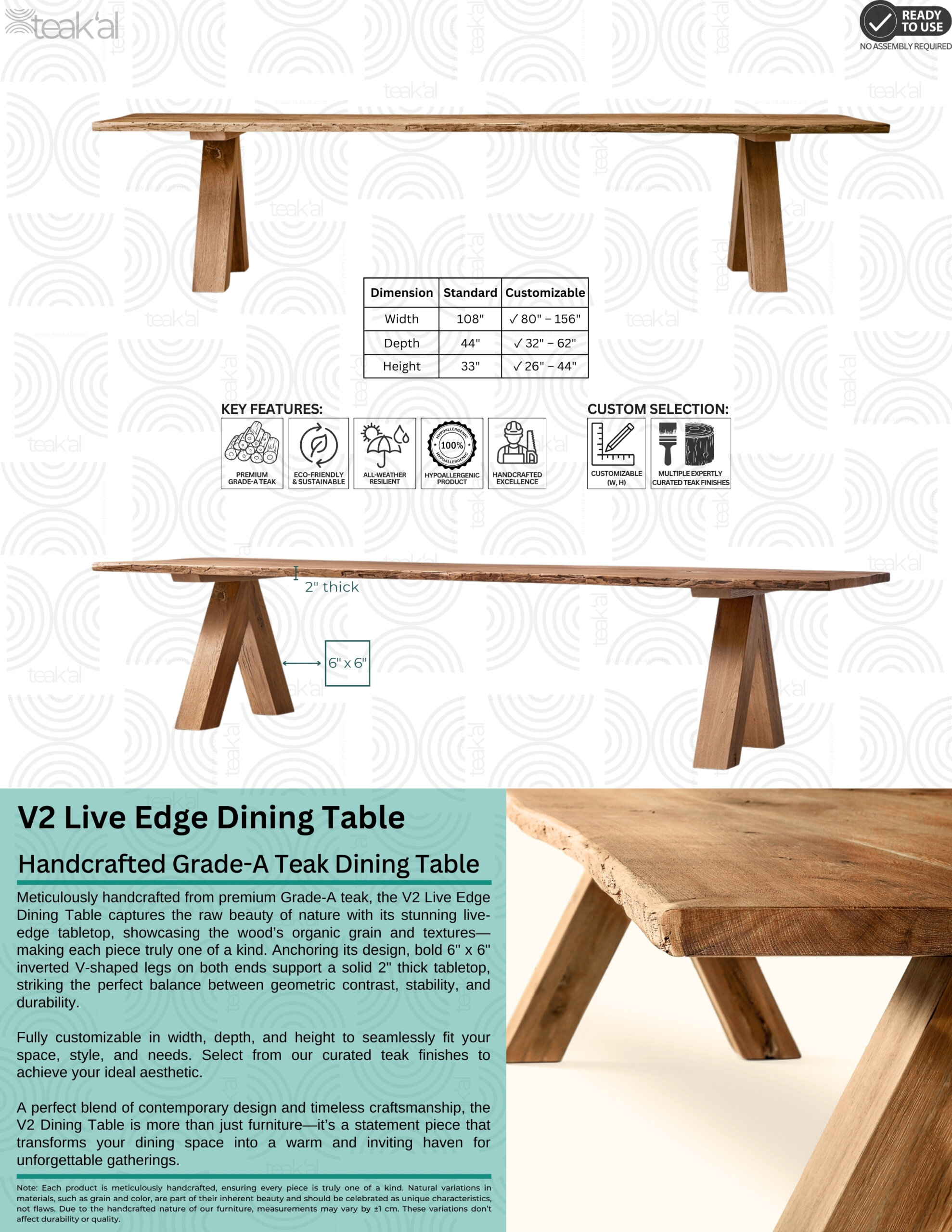 Meticulously handcrafted from premium Grade-A teak, the V2 Live Edge Dining Table captures the raw beauty of nature with its stunning live-edge tabletop, showcasing the wood’s organic grain and textures—making each piece truly one of a kind. Anchoring its design, bold 6″ x 6″ inverted V-shaped legs on both ends support a solid 2″ thick tabletop, striking the perfect balance between geometric contrast, stability, and durability.