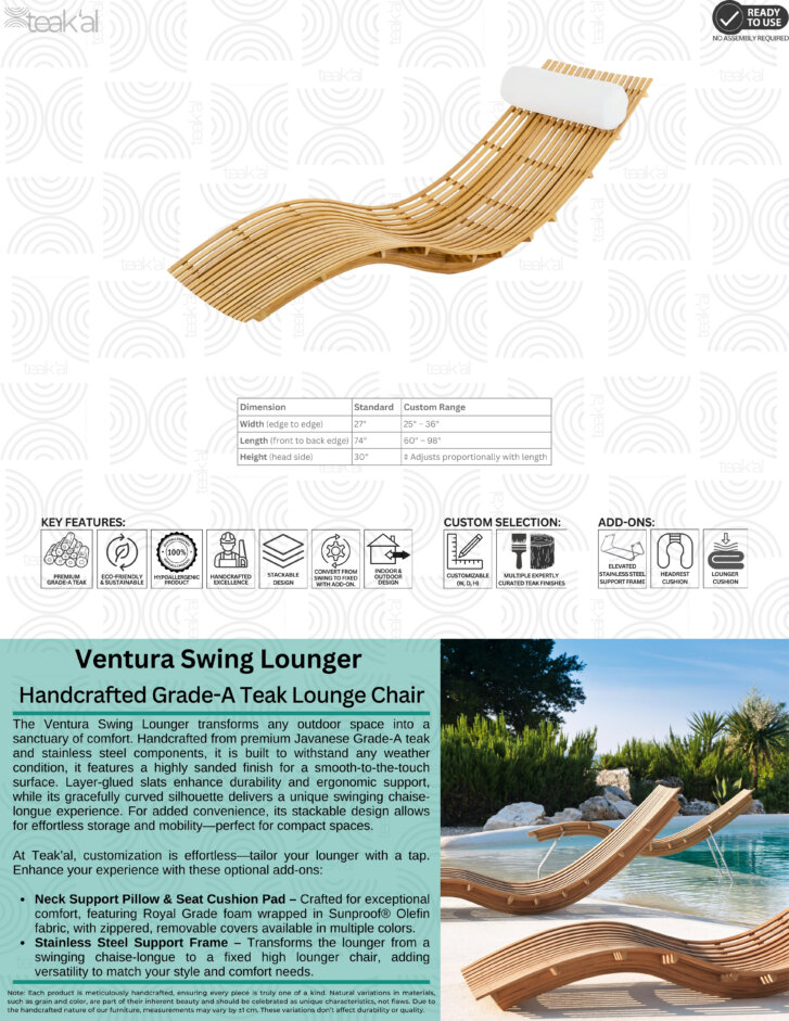 The Ventura Swing Lounger transforms any outdoor space into a sanctuary of comfort. Handcrafted from premium Javanese Grade-A teak, it features a highly sanded finish for a luxuriously smooth touch. Layer-glued slats enhance durability and ergonomic support, while its gracefully curved silhouette delivers a unique swinging chaise-longue experience. For added convenience, its stackable design allows for effortless storage and mobility—perfect for compact spaces.
