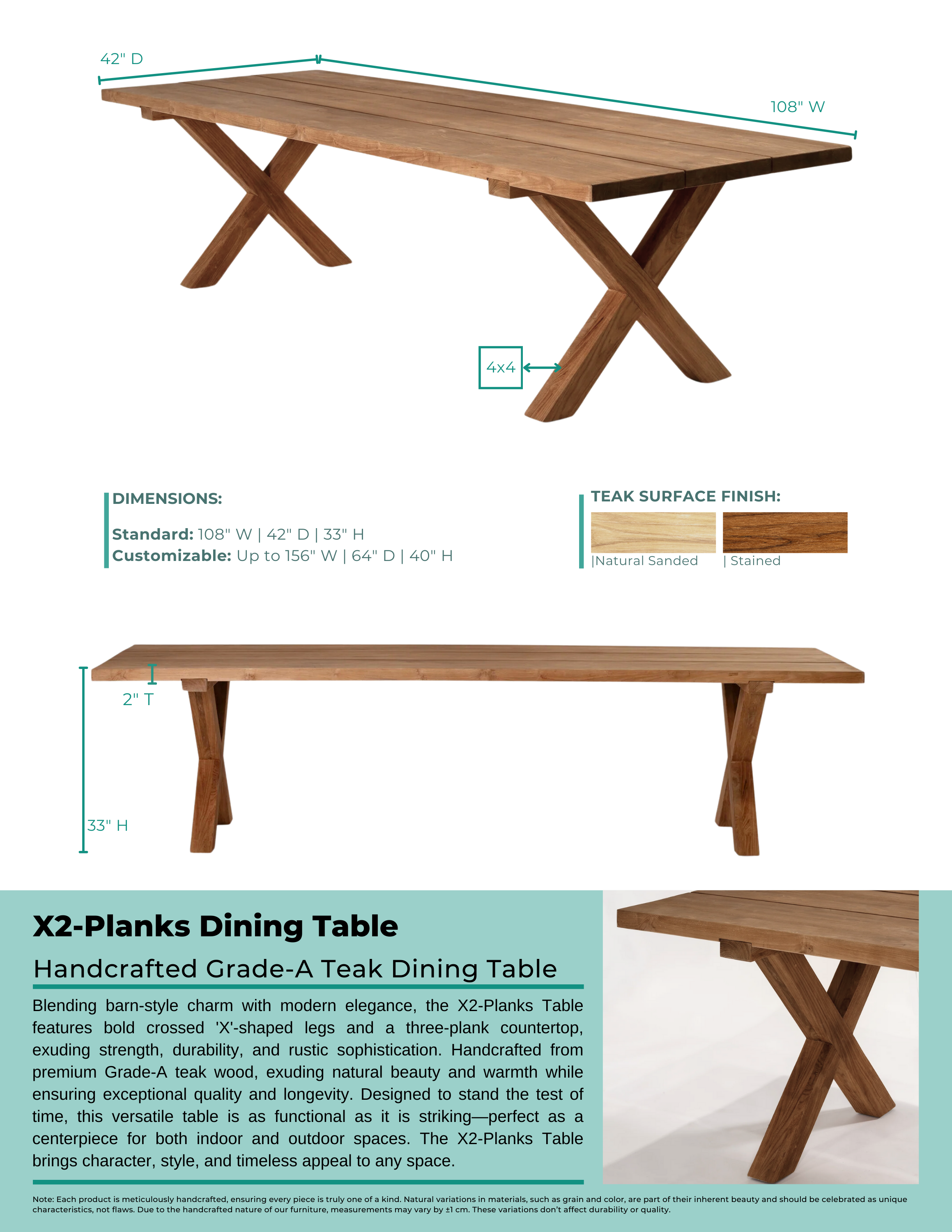 Blending barn-style charm with modern elegance, the X2-Planks Table features bold crossed ‘X’-shaped legs and a three-plank countertop, exuding strength, durability, and rustic sophistication. Handcrafted from premium Grade-A teak wood, exuding natural beauty and warmth while ensuring exceptional quality and longevity. Designed to stand the test of time, this versatile table is as functional as it is striking—perfect as a centerpiece for both indoor and outdoor spaces. The X2-Planks Table brings character, style, and timeless appeal to any space.